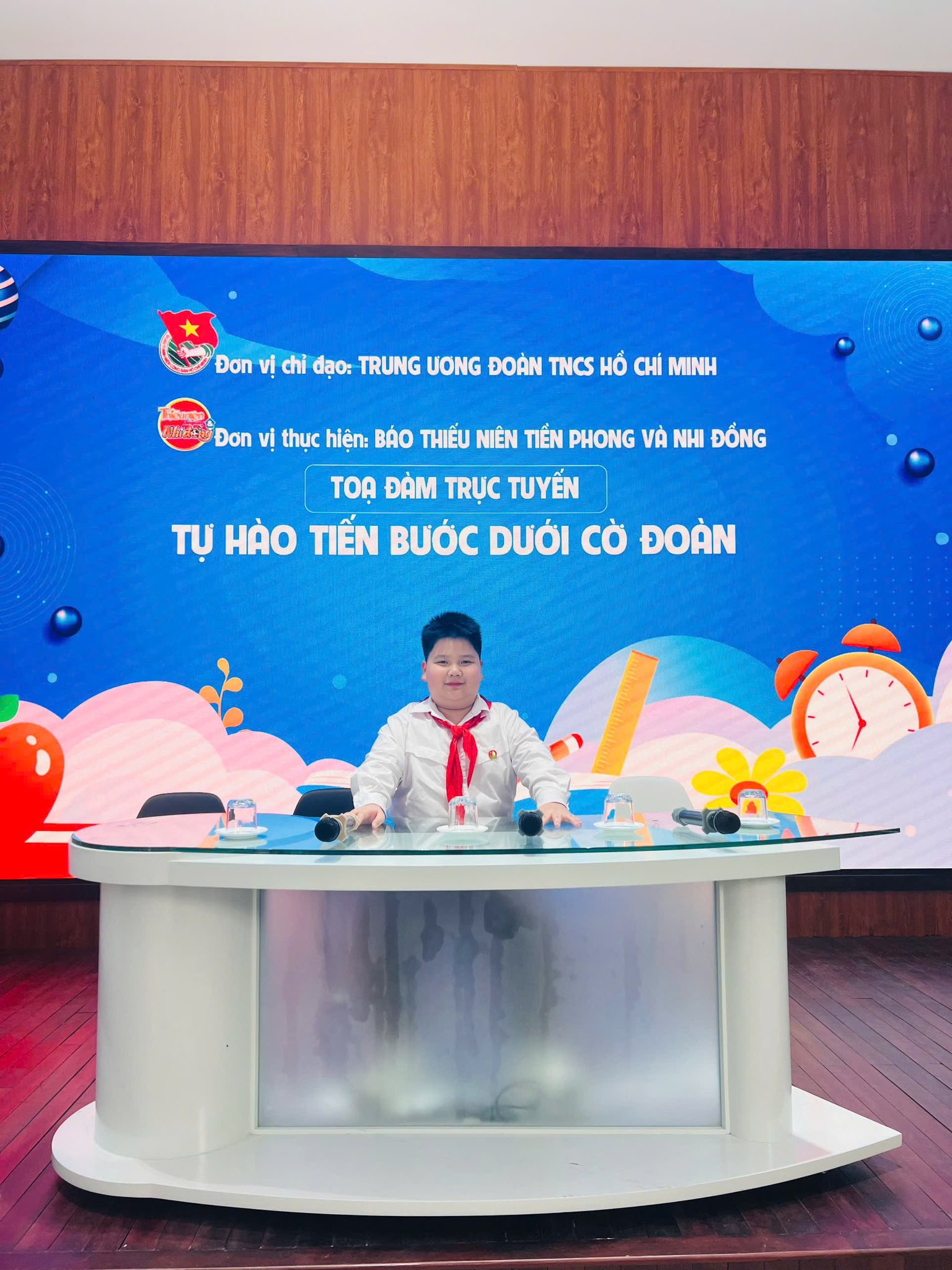 Học sinh Bùi Nguyên Gia Bảo – Liên đội trưởng trường THCS Tây Mỗ 3 tham dự Toạ đàm trực tuyến “Tự hào Tiến bước dưới cờ Đoàn”.