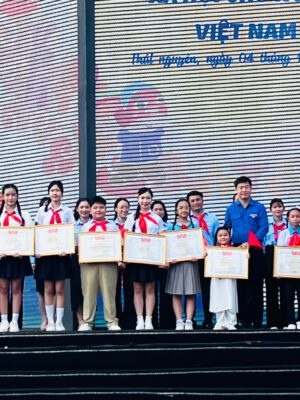 Bà Nguyễn Phạm Duy Trang – Bí thư T.Ư Đoàn, Chủ tịch Hội đồng Đội Trung ương trao bằng khen cho em Bùi Nguyên Gia Bảo, học sinh lớp 6A9, Liên đội trưởng trường THCS Tây Mỗ 3 (Hà Nội).