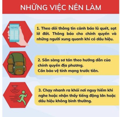 – Chủ động sơ tán khỏi vùng bãi sông, vùng thấp trũng, vùng có nguy cơ sạt lở, lũ quét.