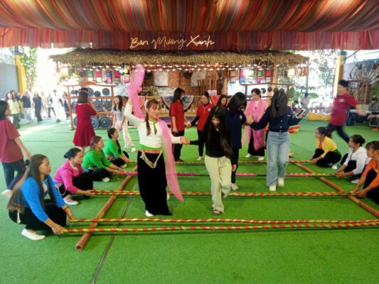 Sau khi rời bảo tàng, đoàn tiếp tục di chuyển đến Khu sinh thái Bản Mường Xanh – một không gian xanh mát với cảnh quan thiên nhiên hùng vĩ. Tại đây, các em học sinh được tham gia vào nhiều hoạt động thú vị như: tìm hiểu văn hóa đặc trưng của người dân tộc Mường, thử sức với các trò chơi dân gian, và khám phá hệ sinh thái đa dạng. Bên cạnh đó, các hoạt động gắn kết tập thể như teambuilding và thưởng thức các món ăn đặc sản đã mang lại những giây phút vui vẻ, ý nghĩa, đồng thời giúp tăng cường sự đoàn kết và kỹ năng làm việc nhóm của các em.